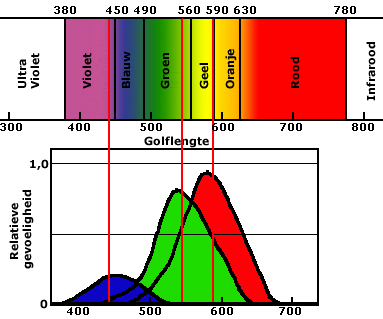 Het zichtbare spectrum heeft een golflengte tussen ca. 400 nm (violet) en 750 nm (rood). Dat komt neer op een frequentie van ca. 400 THz (rood) tot 750 THz (violet). De verschillende golflengten worden door het oog gezien als verschillende kleuren: rood voor de langste golflengte en violet voor de kortste. De grootste gevoeligheid van het menselijk oog ligt bij 555 nm (geelgroen) bij daglicht, en bij 507 nm (blauwgroen) bij nacht.